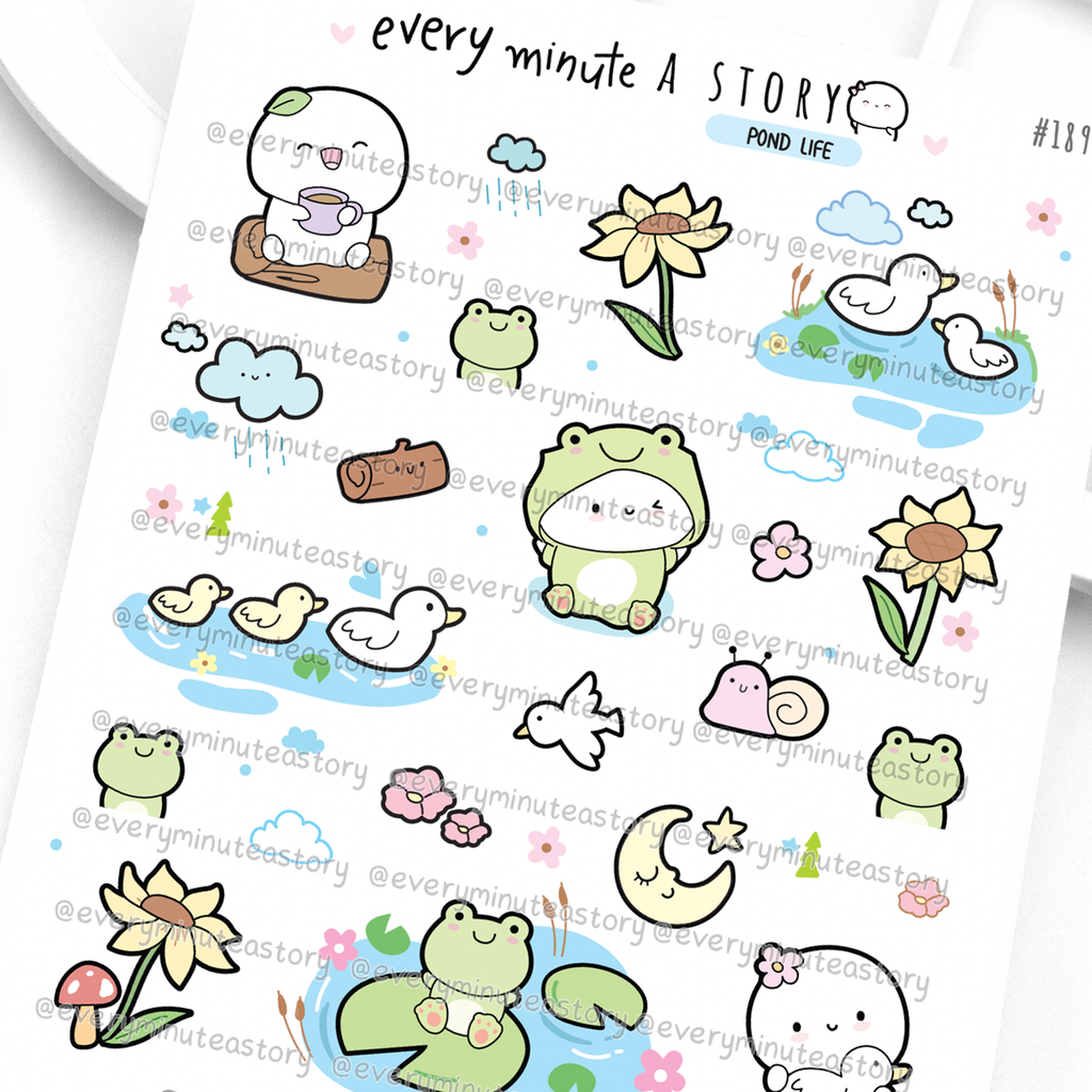 Pond life planner stickers, frog, rainy day, spring