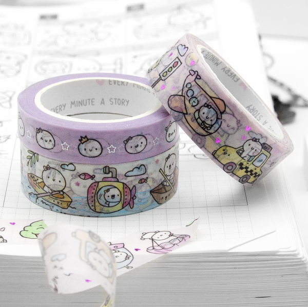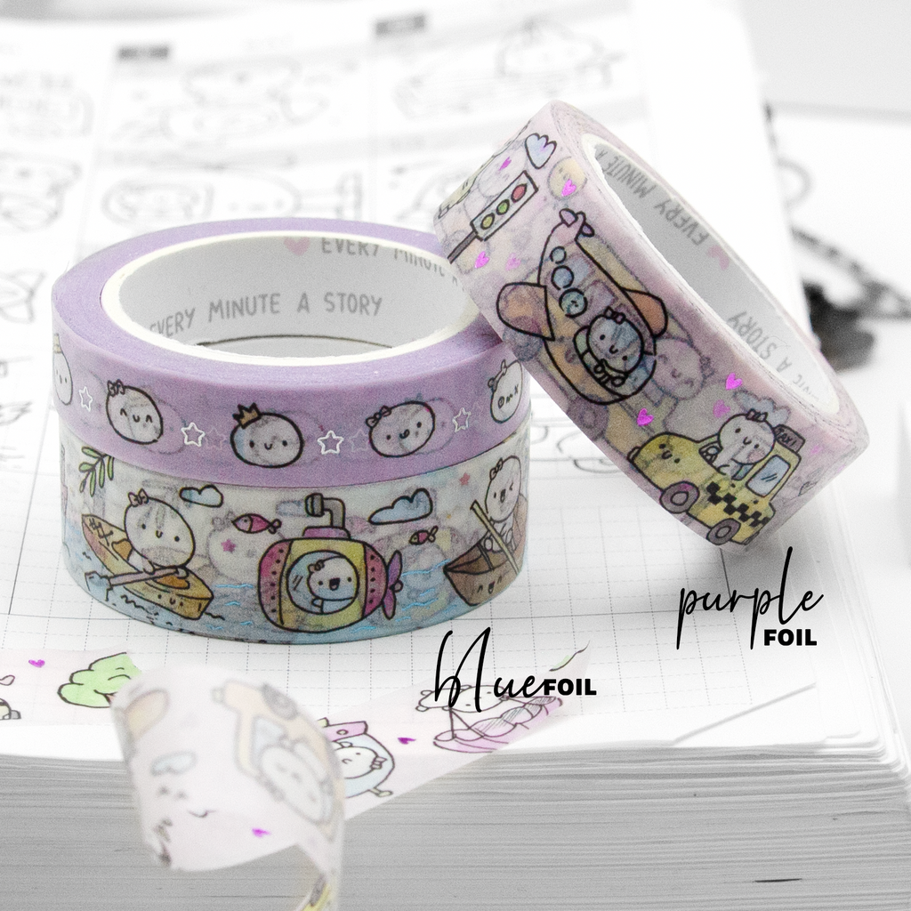 Beanie on Wheels inktober washi, hand sketched, set of 3, silver, blue, purple foil