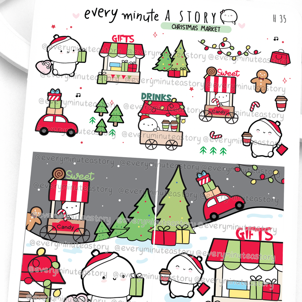 Christmas market stickers, planner stickers, hobonichi cousin weeks, mambi the happy planner, erin condren, kikkik, filofax travellers notebook, bullet journal