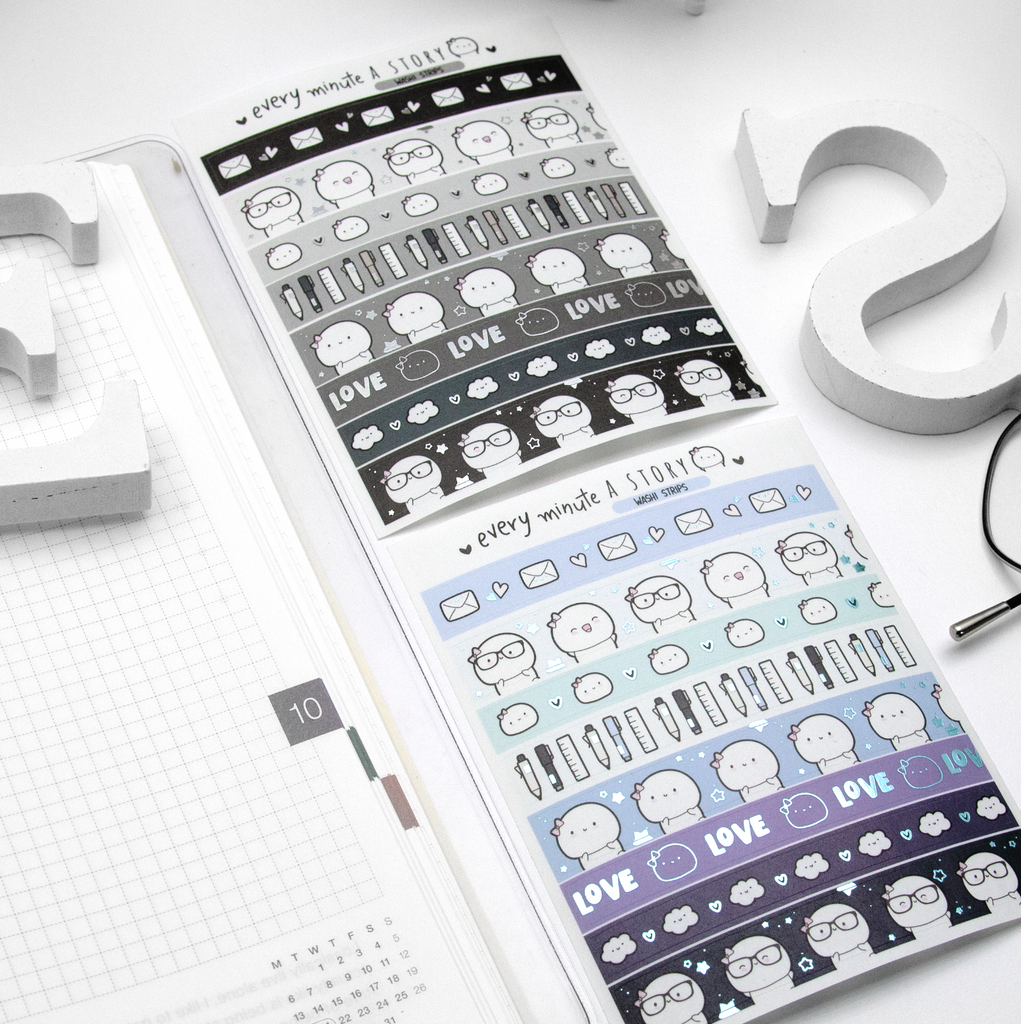 Nerdy Beanie washi strips on washi paper, blue/silver foiled